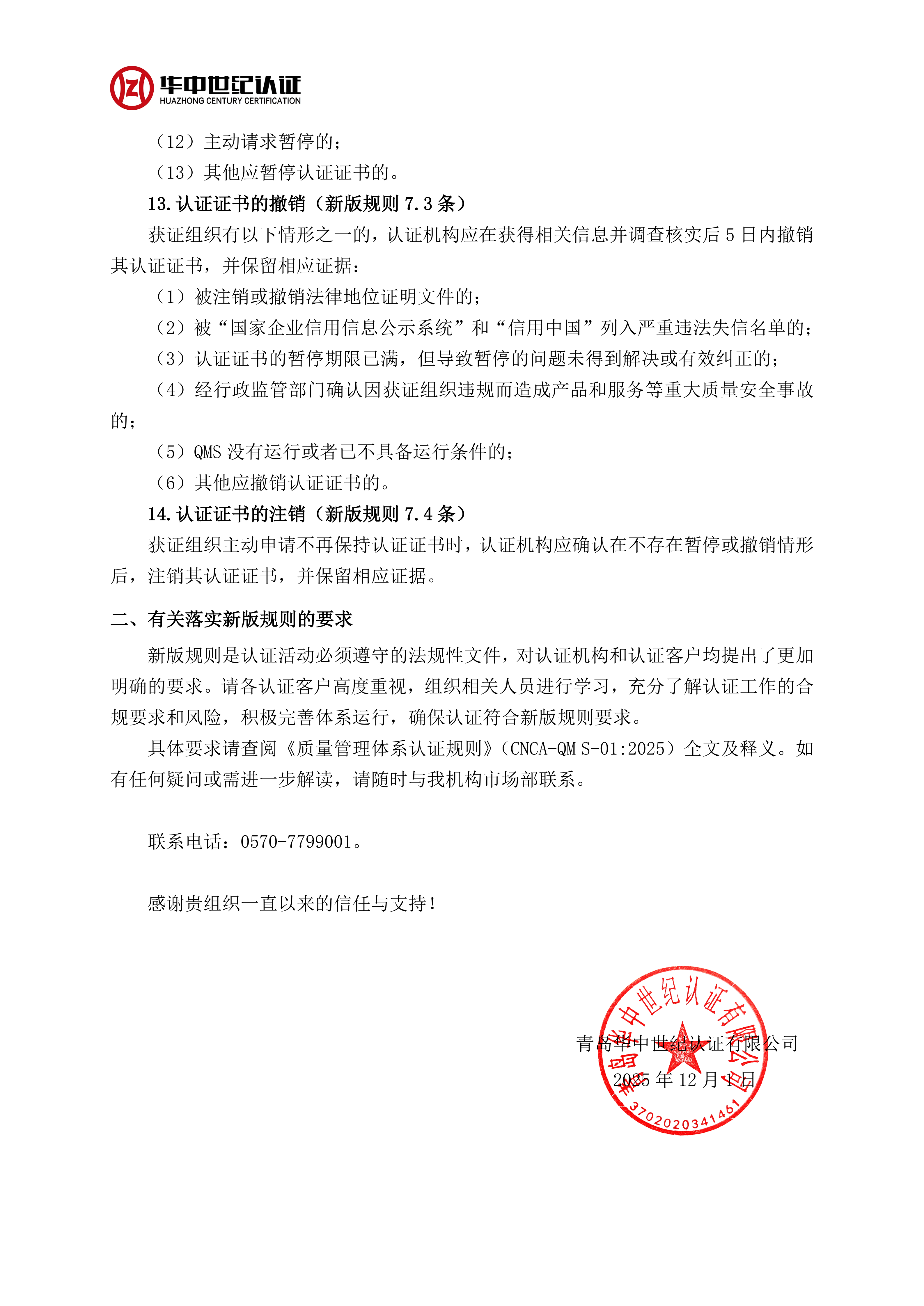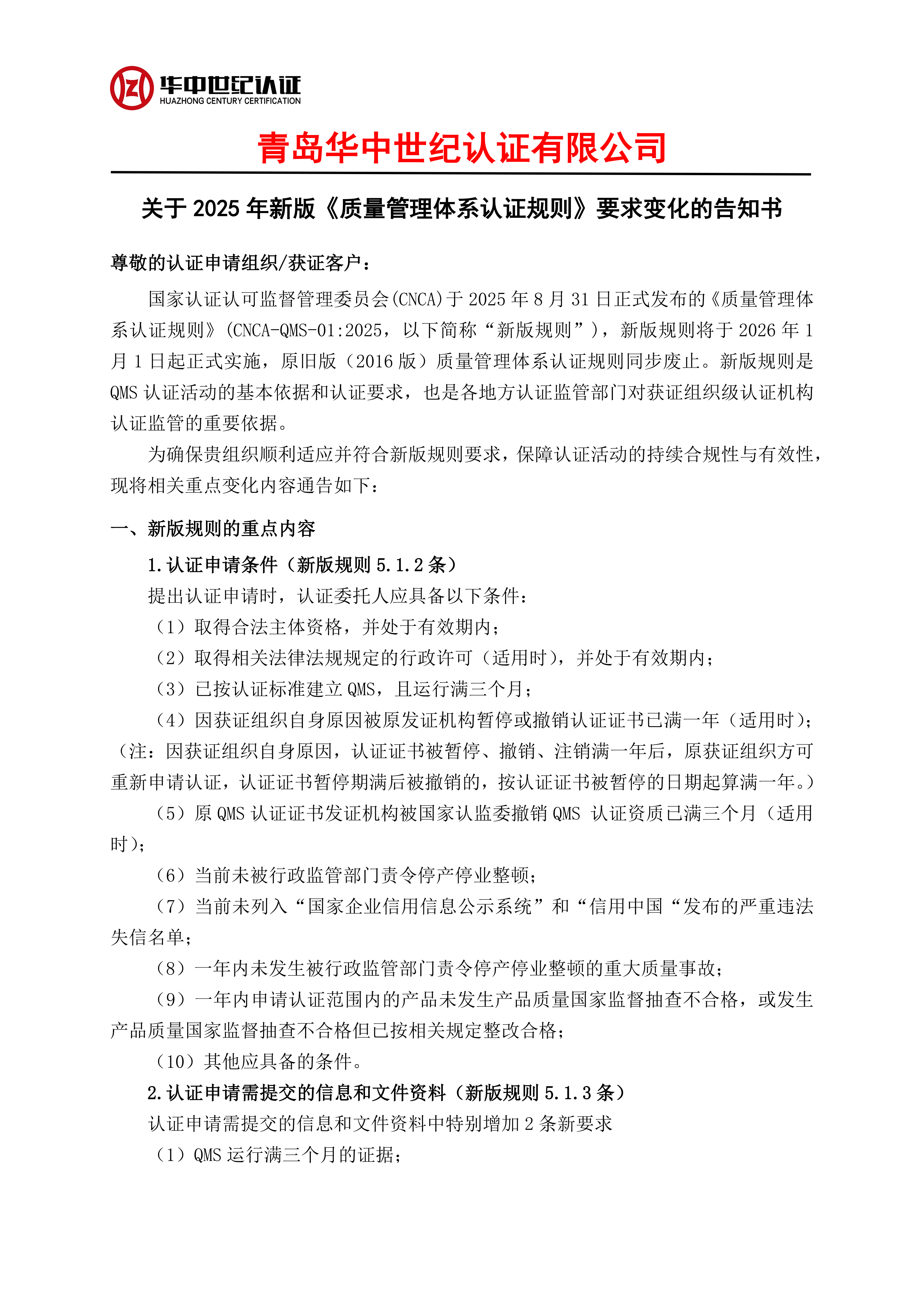 關(guān)于2025年新版《質(zhì)量管理體系認(rèn)證規(guī)則》要求變化的告知書